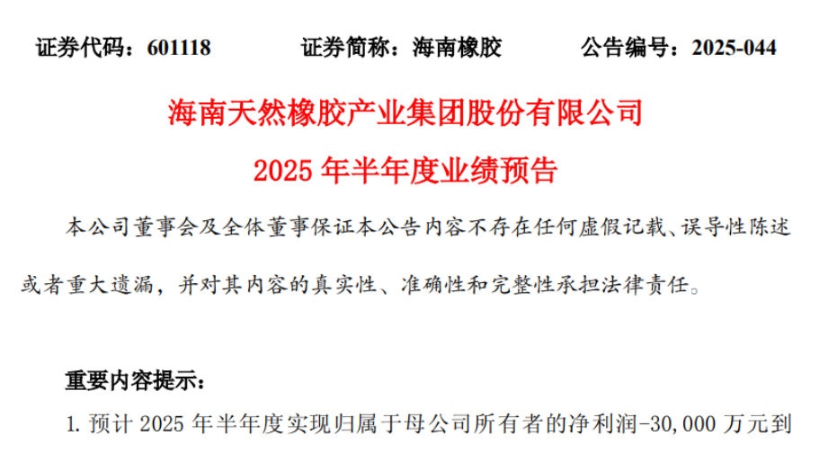海南橡膠2025上半年預(yù)虧2-3億,主業(yè)承壓!