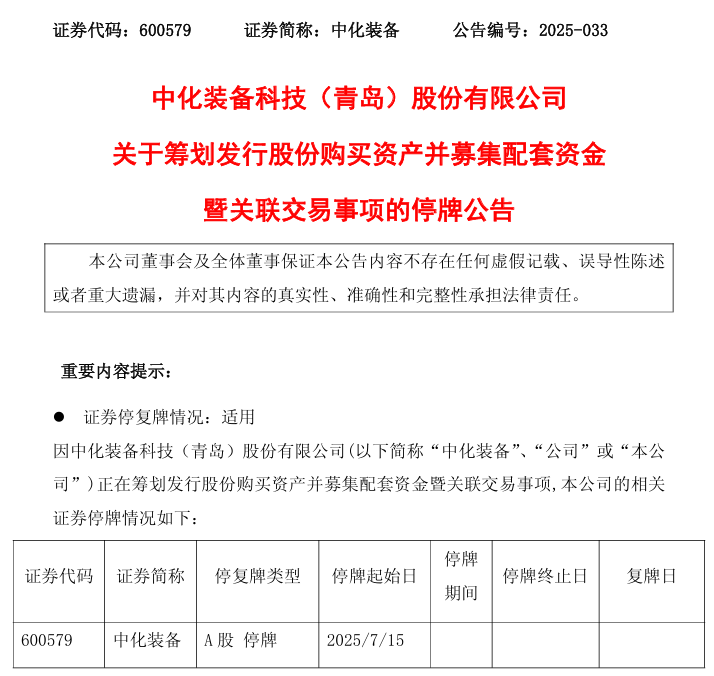【炭黑產(chǎn)業(yè)網(wǎng)】7月24日消息,中化裝備科技(青島)股份有限公司(簡(jiǎn)稱:中化裝備,600579.SH)日前發(fā)布停牌公告,宣布籌劃發(fā)行股份購(gòu)買(mǎi)資產(chǎn)并募集配套資金,此舉與公司重大資產(chǎn)重組計(jì)劃相關(guān)。