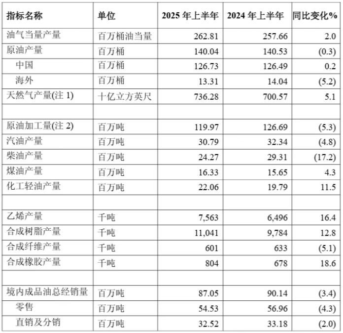 7月24日,中國石化(600028/00386)發(fā)布公告,2025年上半年生產經營業(yè)績提示性數(shù)據。根據公告,油氣當量產量為262.81百萬桶油當量,同比增長2.0%。原油加工量119.97百萬噸,同比下降5.3%;乙烯產量7563千噸,同比增長16.4%;合成樹脂產量1.1萬噸,同比增長12.8%;合成纖維產量601千噸,同比下降5.1%;合成橡膠產量804千噸,同比增長18.6%;境內成品油總經銷量87.05百萬噸,同比下降3.4%。