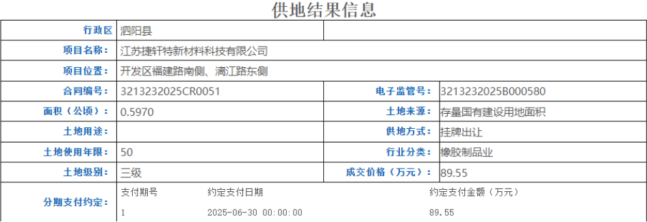 據(jù)炭黑產(chǎn)業(yè)網(wǎng)了解,今年 6 月 30 日,該企業(yè)出資 89.55 萬(wàn)元,成功競(jìng)得 5970 平方米的工業(yè)土地。相關(guān)資料顯示,江蘇捷軒特新材料科技有限公司成立于 2024 年 10 月,注冊(cè)資本為 2000 萬(wàn)元,法定代表人為翁自全,主營(yíng)業(yè)務(wù)包括輪胎的制造與銷售等。值得關(guān)注的是,該公司具有港資背景,香港企業(yè)格瑞達(dá)有限公司持有其 35.5% 的股份。