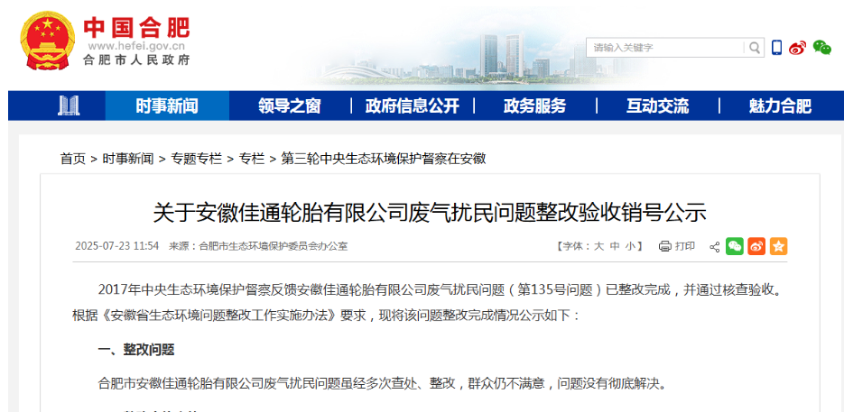 【炭黑產業(yè)網】7 月 27 日消息,2025 年 7 月 23 日,合肥市生態(tài)環(huán)境保護委員會辦公室發(fā)布一則公示,這標志著困擾輪胎行業(yè)多年的環(huán)保難題 —— 安徽佳通輪胎有限公司廢氣擾民問題,在歷經八年整改后,終于通過驗收并準備銷號。這一事件不僅與該企業(yè)的環(huán)保表現(xiàn)息息相關,更折射出輪胎制造行業(yè)在發(fā)展進程中普遍面臨的環(huán)保挑戰(zhàn)與轉型壓力。