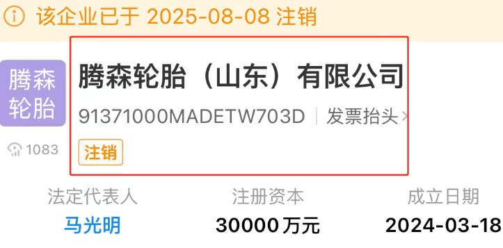 【炭黑產(chǎn)業(yè)網(wǎng)】8 月 11 日消息,在行業(yè)的動(dòng)態(tài)變遷中,騰森輪胎(山東)有限公司的狀態(tài)更新引起了廣泛關(guān)注。于 2025 年 8 月 8 日,這家公司正式將其經(jīng)營(yíng)狀態(tài)從原本的 “在業(yè)” 轉(zhuǎn)變?yōu)?“注銷”。