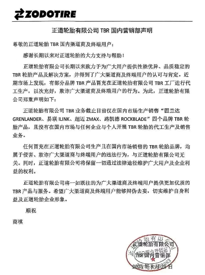 【炭黑產(chǎn)業(yè)網(wǎng)】8 月 27 日消息, 近日,正道輪胎有限公司 TBR 國內(nèi)營銷部鄭重發(fā)聲,向市場各界宣告了其在 TBR 業(yè)務(wù)領(lǐng)域的關(guān)鍵信息。聲明中明確指出,截至當下,正道輪胎在國內(nèi)市場開展的 TBR 業(yè)務(wù)僅圍繞 “固蘭達 GRENLANDER、易聯(lián) ILINK、超邁 ZMAX、路凱德 ROCKBLADE” 這四個品牌的 TBR 輪胎產(chǎn)品進行生產(chǎn)與銷售。與此同時,公司嚴正聲明,在國內(nèi)市場從未與任何企業(yè)或個人開展 TBR 輪胎的代工生產(chǎn)及銷售業(yè)務(wù)。