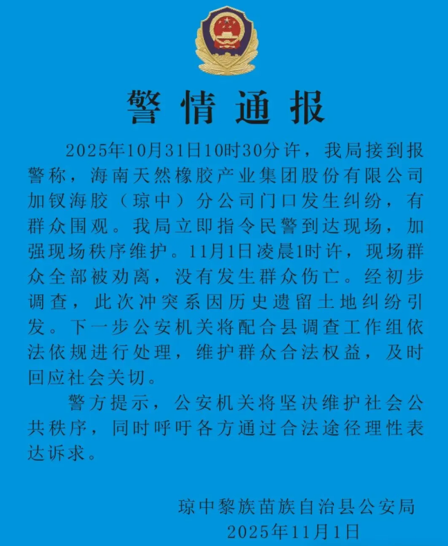 10月31日10時(shí)30分許,瓊中縣公安局接到報(bào)警稱,海南天然橡膠產(chǎn)業(yè)集團(tuán)股份有限公司加釵海膠(瓊中)分公司門口發(fā)生糾紛,有群眾圍觀。公安機(jī)關(guān)立即指令民警抵達(dá)現(xiàn)場(chǎng),加強(qiáng)秩序維護(hù)工作。至11月1日凌晨1時(shí)許,現(xiàn)場(chǎng)群眾已全部被勸離,事件中未造成群眾傷亡。經(jīng)初步調(diào)查,此次沖突系歷史遺留土地糾紛引發(fā)。