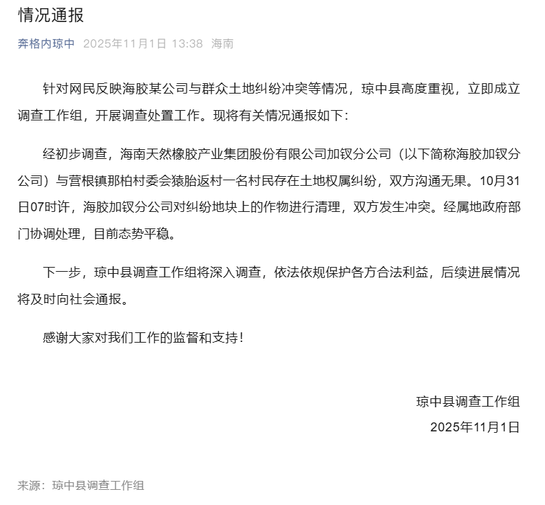 2025年11月1日,海南瓊中黎族苗族自治縣公安局及當(dāng)?shù)卣{(diào)查工作組先后就10月31日發(fā)生的一起土地糾紛沖突事件發(fā)布通報(bào),還原事件經(jīng)過并說明后續(xù)處置方向。