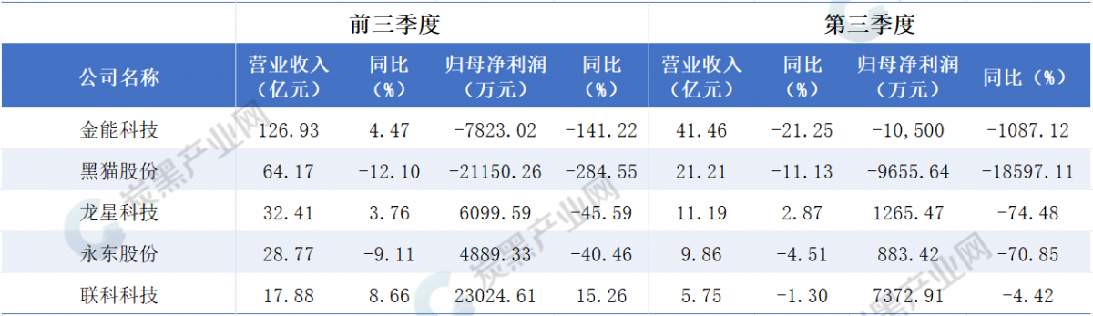 黑貓股份在營業(yè)收入和凈利潤方面,下降幅度和虧損擴(kuò)大幅度在五家企業(yè)中均為最大,業(yè)績下滑嚴(yán)重。黑貓股份表示,系產(chǎn)品銷售單價(jià)同比下降導(dǎo)致營收同比減少。