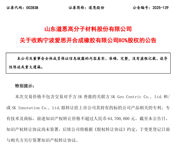 【炭黑產業(yè)網】12月11日消息,12月10日晚間,道恩股份對外發(fā)布了一則重要公告,宣布計劃收購寧波愛思開合成橡膠有限公司(以下簡稱“寧波SK”)80%的股權。一旦此次交易順利完成,寧波SK將正式成為道恩股份旗下的控股子公司,這一舉措將助力道恩股份在彈性體領域進一步優(yōu)化產業(yè)布局,同時開拓更多的應用場景。