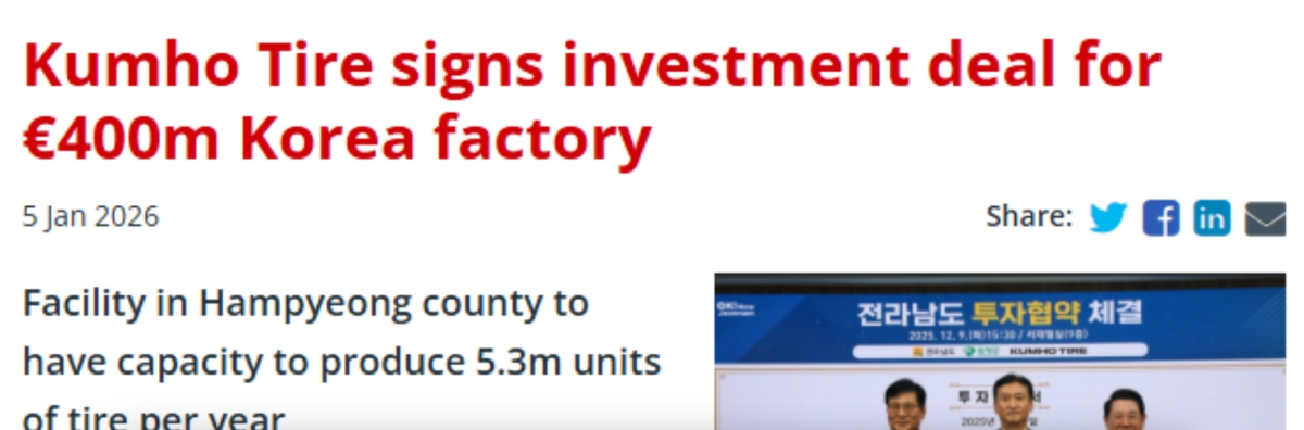 近日,錦湖輪胎對(duì)外宣布,已正式簽署投資協(xié)議,計(jì)劃在韓國(guó)西南部咸平郡的Bitgreen工業(yè)園區(qū)打造一座全新的輪胎制造廠。