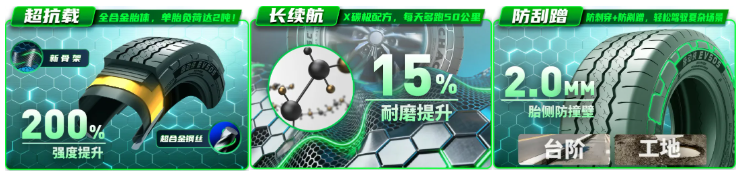 胎體采用與貝卡爾特聯(lián)合研發(fā)的超強超韌全合金鋼絲,強度比普通鋼絲高40%,比半鋼胎聚酯簾線超200%,加上冠部多層保護和行業(yè)首創(chuàng)成型工藝,打造全球首創(chuàng)全體合金胎體,單胎載荷可達2噸,超該規(guī)格國標70%。輪胎配方采用X碳極 - 超級VAN卡專用配方,匹配180mm超寬胎面和9.5mm花紋深,耐磨性提升15%,耐疲勞、抗腐蝕性能提升50% +。此外,EV505具備獨特的冠部抗刺穿和胎側(cè)防剮蹭設(shè)計,胎側(cè)2mm厚度的防刮擦橡膠塊加強設(shè)計,降低故障率,輕松駕馭城配主流貨運場景。