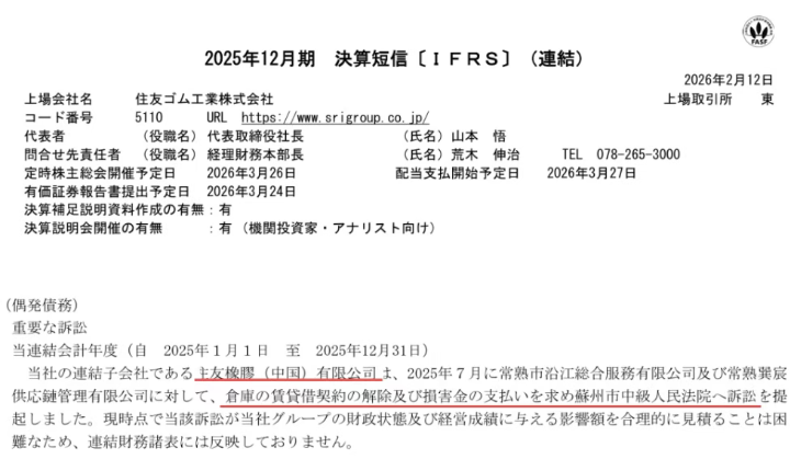 此外,財(cái)報(bào)還披露了住友橡膠常熟工廠近期在法律訴訟方面的情況。該工廠在蘇州市中級人民法院對兩家國內(nèi)企業(yè)提起了訴訟,涉及倉庫租賃糾紛,并要求支付賠償金。盡管財(cái)報(bào)并未說明具體涉訴金額,但特意提及此事,引發(fā)了外界對賠償金額可能不小的猜測。截至2月14日,該案尚未被收錄在企業(yè)工商信息查詢平臺的司法案件中。