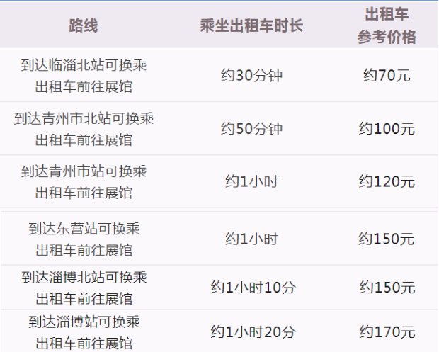 (可選擇乘坐高鐵至臨淄北站、青州市北站、青州市站、淄博北站、淄博站、東營站等站點(diǎn)下車,再換乘出租車前往展館。)