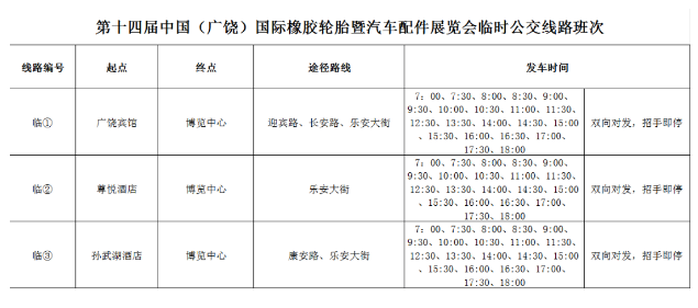 為全方位、多角度滿足輪胎展期間廣大市民、參觀人員乘車需要,決定自5月15日至17日輪胎展期間,分別開通廣饒賓館、宇通尊悅國際酒店、華泰孫武湖溫泉度假酒店至廣饒國際博覽中心3條臨時(shí)公交線路,采取不固定公交站點(diǎn),雙向?qū)Πl(fā),招手即停方式,方便乘客出行。