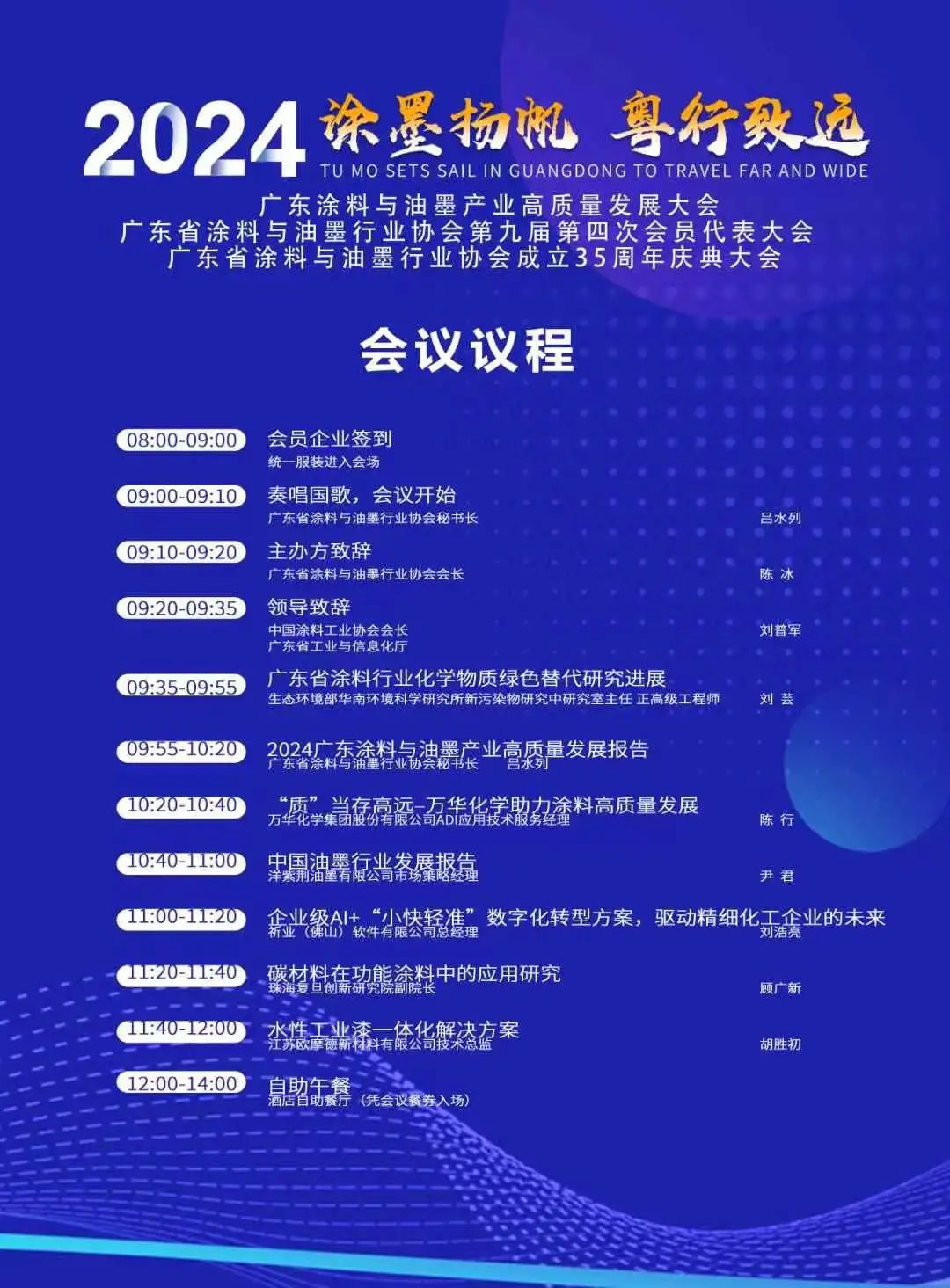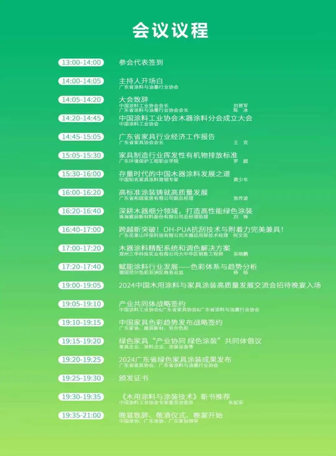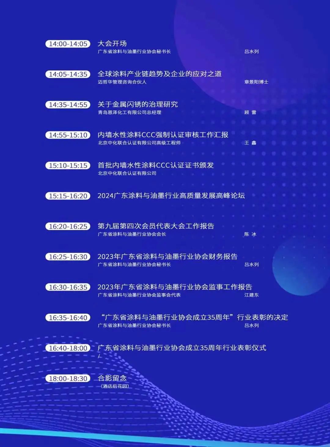 為期2天的會議全程干貨,聚焦當(dāng)下時政熱點、核心熱點解讀。7月30日,將聚焦CCC認(rèn)證、以及涂料油墨行業(yè)高質(zhì)量發(fā)展等重點內(nèi)容,同期還將舉辦廣東省涂料與油墨行業(yè)協(xié)會第九屆第四次會員代表大會、2024廣東涂料與油墨產(chǎn)業(yè)高質(zhì)量發(fā)展大會、廣東省涂料與油墨行業(yè)協(xié)會成立35周年慶典大會、2024木用涂料與家具涂裝高質(zhì)量發(fā)展峰會、廣東省綠色木用涂料涂裝品牌聯(lián)展、廣東省涂料與油墨行業(yè)協(xié)會第九屆第六次工作會議、廣東省涂料行業(yè)協(xié)會第九屆第四次會員大會答謝晚宴……。