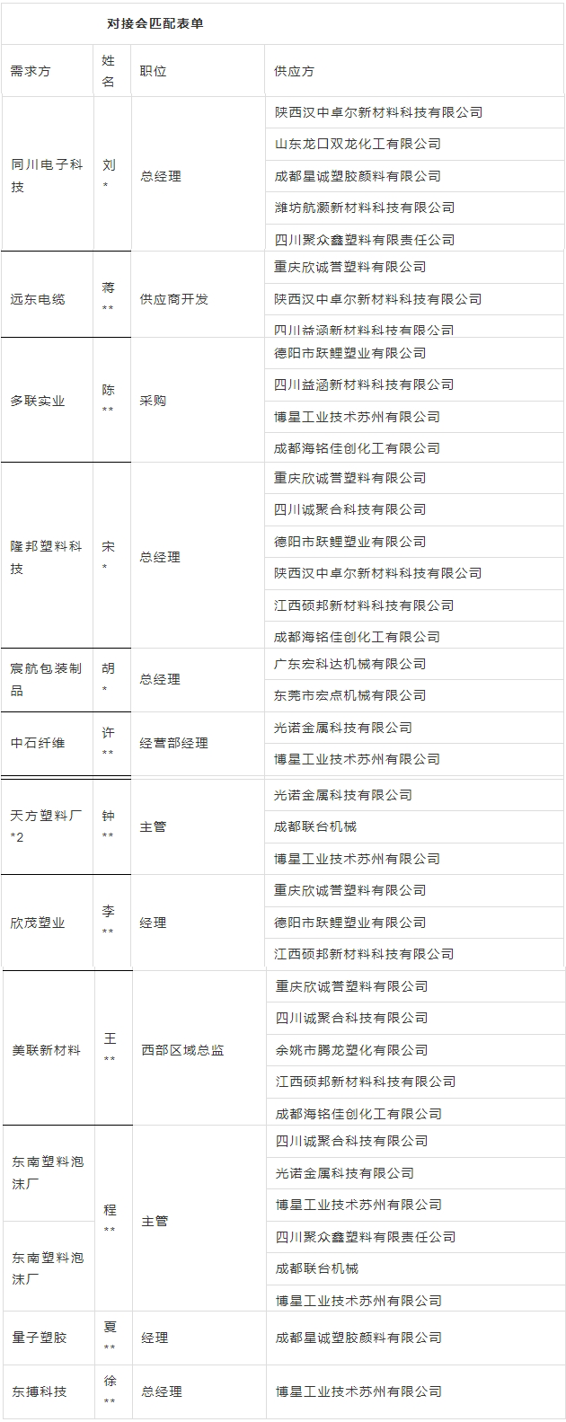 本次活動(dòng)組委會(huì)特別了解到遠(yuǎn)東電纜未能尋找到四川本地PVC、低煙無(wú)鹵、光伏、PE、硅烷等材料供應(yīng)企業(yè);江蘇中石纖維未能尋找到包裝制品 ;重慶宸航未能匹配到合適的吹膜機(jī)、造粒機(jī)、制袋機(jī)廠家,歡迎各大供應(yīng)商企業(yè)聯(lián)系組委會(huì)對(duì)接需求。