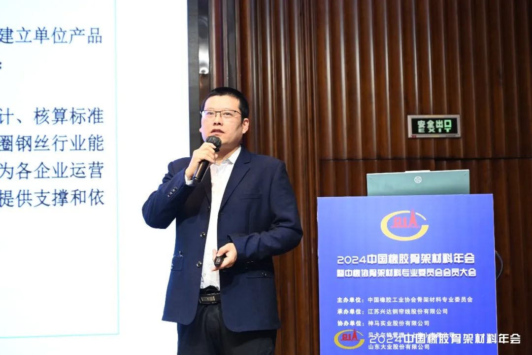 中國橡膠工業(yè)協(xié)會副秘書長兼骨架材料專業(yè)委員會秘書長于濤作理事會工作報告。兩年來,在嚴峻復雜的形勢和諸多超預期因素沖擊下,骨架材料行業(yè)面臨較大困難,行業(yè)內卷嚴重,造成行業(yè)整體經營壓力增大,利潤下滑,呈現增產不增利的局面。最近統(tǒng)計的2024年前三季度數據顯示,完成總產量413.16萬噸,增長11.57%。鋼簾線出口量66.78萬噸,增長23.47%,出口占比27.66%。胎圈鋼絲出口14.02萬噸,增長5.94%,占比16.44%。主要骨架材料產品出口均保持較高的增速,占比不斷增加。但行業(yè)利潤下降33.65%,整個行業(yè)銷售收入利潤率僅為2.55%,相比去年同期的3.7%,減少1.2個百分點,遠低于整個橡膠行業(yè)6.16%的平均值,只比炭黑行業(yè)高了一點。