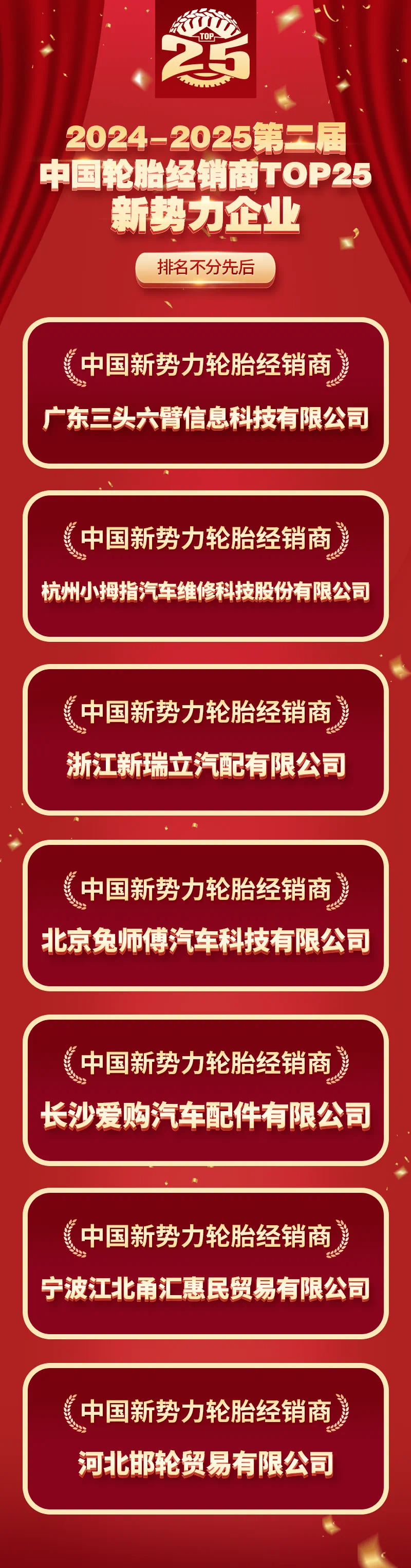 李發(fā)榮代表第二屆中國輪胎經(jīng)銷商TOP25評(píng)審委員會(huì)公布榜單該榜單經(jīng)行業(yè)權(quán)威機(jī)構(gòu)推薦、實(shí)地走訪調(diào)研,依據(jù)合法守規(guī)、誠信經(jīng)營、年銷規(guī)模、創(chuàng)新突破等多維評(píng)審篩選,產(chǎn)生2024-2025年度“中國輪胎經(jīng)銷商TOP25”、“中國優(yōu)秀輪胎經(jīng)銷商”以及“中國新勢(shì)力輪胎經(jīng)銷商”企業(yè)共39家,經(jīng)前期公示得到全行業(yè)的一致認(rèn)可。