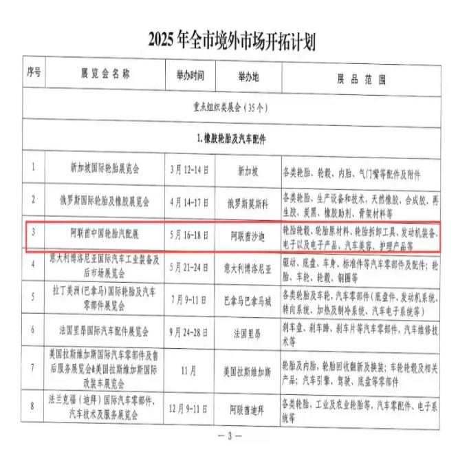 近期,東營市商務(wù)局發(fā)布了關(guān)于2025年度境外市場開拓計(jì)劃的通知,通知中顯示,2025年度境外市場開拓計(jì)劃擬安排160個(gè)展會(huì)項(xiàng)目,其中重點(diǎn)組織類展會(huì)35個(gè)、重點(diǎn)推薦類展會(huì)125個(gè)。其中,阿聯(lián)酋中國輪胎汽配展成功入選東營市2025年度境外市場開拓重點(diǎn)組織類展會(huì)。