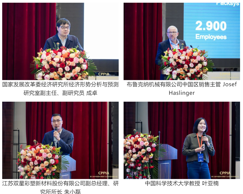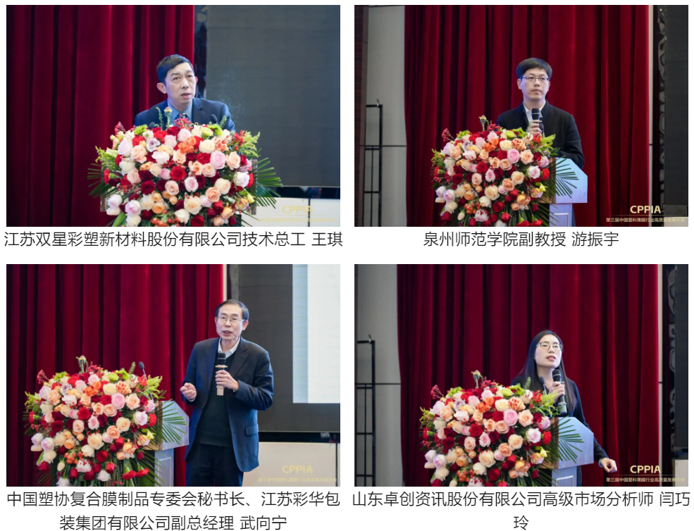 報告環(huán)節(jié)由中國塑料加工工業(yè)協(xié)會秘書長焦紅文,華中科技大學副校長、教授解孝林,中國塑料加工工業(yè)協(xié)會副理事長田巖,生態(tài)環(huán)境部對外合作與交流中心首席科學家肖學智,中國汽車技術研究中心有限公司數(shù)智化總監(jiān)廖少華,中國石化集團公司高級專家張師軍,浙江赤霄智能檢測技術有限公司總經(jīng)理王暾,蘭臺律師事務所高級合伙人陳靜,國家發(fā)展改革委經(jīng)濟研究所經(jīng)濟形勢分析與預測研究室副主任、副研究員成卓,布魯克納機械有限公司中國區(qū)銷售主管Josef Haslinger,江蘇雙星彩塑新材料股份有限公司副總經(jīng)理、研究所所長朱小磊,中國科學技術大學教授葉亞楠,江蘇雙星彩塑新材料股份有限公司技術總工王琪,泉州師范學院副教授游振宇,中國塑協(xié)復合膜制品專委會秘書長、江蘇彩華包裝集團有限公司副總經(jīng)理武向寧,山東卓創(chuàng)資訊股份有限公司高級市場分析師閆巧玲分別作《中國塑料加工業(yè)和塑料薄膜產業(yè)現(xiàn)狀及發(fā)展建議》、《AR/VR顯示用全息塑料的研究進展》、《我國塑料加工業(yè)標準進展情況》、《終結塑料污染國際法律文書談判進展分析》、《智能制造與數(shù)字化轉型創(chuàng)新》、《塑料薄膜產業(yè)可持續(xù)發(fā)展技術的研究開發(fā)》、《機器視覺檢測讓薄膜表面缺陷無處遁形》、《塑料薄膜行業(yè)對外貿易和投資流程和合規(guī)管理》、《貫徹落實中央經(jīng)濟工作會議精神--2025年宏觀經(jīng)濟形勢分析》、《全球雙拉薄膜生產發(fā)展趨勢》、《光學膜助力新型顯示市場發(fā)展》、《國家同步輻射光源——依托國之重器:引領薄膜產業(yè)創(chuàng)新》、《半導體、光電行業(yè)MLCC用離型膜技術及市場分析》、《微結構光學功能薄膜技術》、《環(huán)境友好型塑料軟包裝的需求與技術研發(fā)》、《中國包裝薄膜市場現(xiàn)狀及未來展望》主題報告。