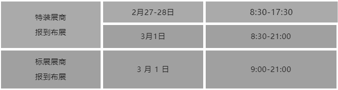 各位展商請(qǐng)于2月27日-3月1日,8:30-17:30,到「物流通道7號(hào)門(mén)」報(bào)到,請(qǐng)攜帶名片或身份證及參展合同領(lǐng)取參展證件,進(jìn)館前展位費(fèi)需要支付全部款項(xiàng)。