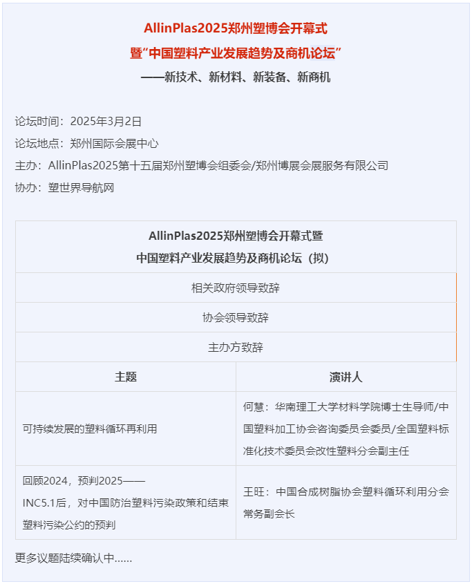 AllinPlas2025第十五屆中國(鄭州)塑料產(chǎn)業(yè)博覽會(huì)將于2025年3月2-4日在鄭州國際會(huì)展中心隆重舉行。作為中國內(nèi)陸地區(qū)極具影響力的塑料行業(yè)盛會(huì),本屆展會(huì)將全方位展示塑料產(chǎn)業(yè)的新技術(shù)、新材料、新裝備,為行業(yè)企業(yè)提供交流合作的優(yōu)質(zhì)平臺(tái)。展會(huì)同期將舉辦"中國塑料產(chǎn)業(yè)發(fā)展趨勢(shì)及商機(jī)高峰論壇",這是一場(chǎng)匯聚行業(yè)精英、共探發(fā)展未來的高端論壇。論壇將聚焦塑料行業(yè)的新技術(shù)、新材料與新裝備,重點(diǎn)探討高性能復(fù)合材料、循環(huán)回收技術(shù)以及新能源車用材料、加工設(shè)備等的發(fā)展趨勢(shì)和商業(yè)機(jī)遇,邀請(qǐng)嘉賓從不同角度出發(fā),分享他們?cè)谒芰闲袠I(yè)的豐富經(jīng)驗(yàn)和獨(dú)到見解,展開深入探討,旨在為塑料產(chǎn)業(yè)的可持續(xù)高質(zhì)量發(fā)展提供思路與方向。