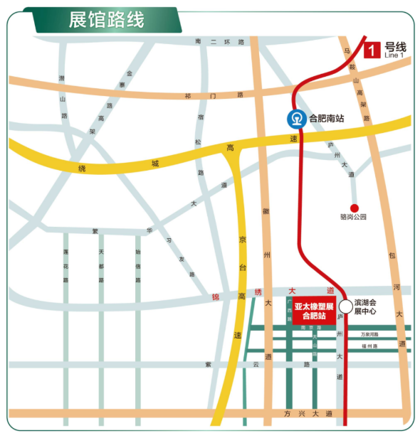 從合肥南站乘坐地鐵1號線,經過4站即可到達合肥濱湖國際會展中心。
