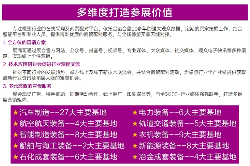 沈陽金之諾會(huì)展有限公司與遼寧省橡膠工業(yè)協(xié)會(huì)簽署“東北亞橡塑機(jī)械及制品展暨技術(shù)交流大會(huì)”戰(zhàn)略合作協(xié)議,計(jì)劃于2025年9月1-4日在沈陽國際展覽中心舉辦第二屆東北亞橡塑機(jī)械及制品展暨技術(shù)交流大會(huì),發(fā)揮各自優(yōu)勢(shì),共拓市場(chǎng),攜手打造橡塑工業(yè)領(lǐng)域國際化、專業(yè)化展覽平臺(tái)。