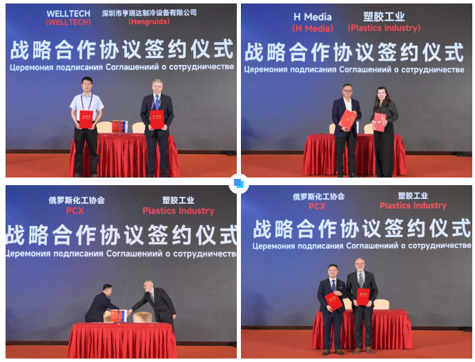 隨后,精彩的簽約儀式拉開帷幕。WELLTECH和深圳市亨瑞達(dá)制冷設(shè)備有限公司,H Media和《塑膠工業(yè)》,俄羅斯化工協(xié)會(huì)和《塑膠工業(yè)》現(xiàn)場(chǎng)完成簽約,這不僅是雙方資源互補(bǔ)、互利共贏的開端,更是深化合作、共謀未來的重要里程碑。