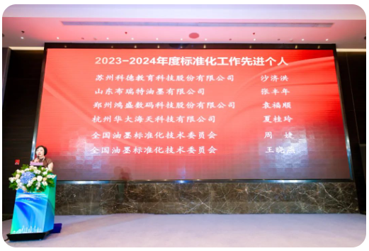 會(huì)上,全國(guó)油墨標(biāo)準(zhǔn)化技術(shù)委員會(huì)對(duì)2023-2024年度標(biāo)準(zhǔn)化工作先進(jìn)個(gè)人進(jìn)行了表彰,12位行業(yè)專(zhuān)家獲此殊榮,他們分別在標(biāo)準(zhǔn)起草、技術(shù)攻關(guān)和行業(yè)服務(wù)中成績(jī)突出。浙江浦江永進(jìn)工貿(mào)有限公司劉國(guó)文、鄭州鴻盛數(shù)碼科技股份有限公司袁福順作為典型代表上臺(tái)分享在標(biāo)準(zhǔn)化工作中心得體會(huì)。
