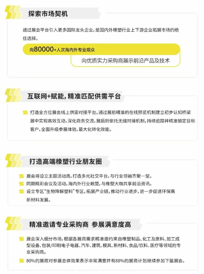 “華塑展”品牌由際華展覽以“順應(yīng)市場發(fā)展趨勢,展示核心科技產(chǎn)品,助推產(chǎn)業(yè)轉(zhuǎn)型升級,搭建供需貿(mào)易平臺”為目標(biāo),結(jié)合區(qū)位優(yōu)勢及整合行業(yè)資源,緊跟行業(yè)發(fā)展大勢,積極探尋創(chuàng)新發(fā)展,精心打造的塑料橡膠行業(yè)高端供需平臺,在這里,新產(chǎn)品如繁星點點,新工藝如流光溢彩,新理念如春風(fēng)拂面,匯聚成一片創(chuàng)新與智慧的海洋。華塑展,作為橡塑行業(yè)交流的平臺,供需對接的堅實橋梁,增進(jìn)了企業(yè)與終端客戶的貿(mào)易經(jīng)濟(jì)交流,為參會客商帶來更大效益。 每一屆華塑展,都是對橡塑行業(yè)最新科技成果和未來趨勢的一次深度探索,促進(jìn)產(chǎn)業(yè)鏈上下游的緊密合作,加速新技術(shù)、新產(chǎn)品的市場化進(jìn)程,為橡塑行業(yè)的持續(xù)發(fā)展注入了不竭的動力與靈感。