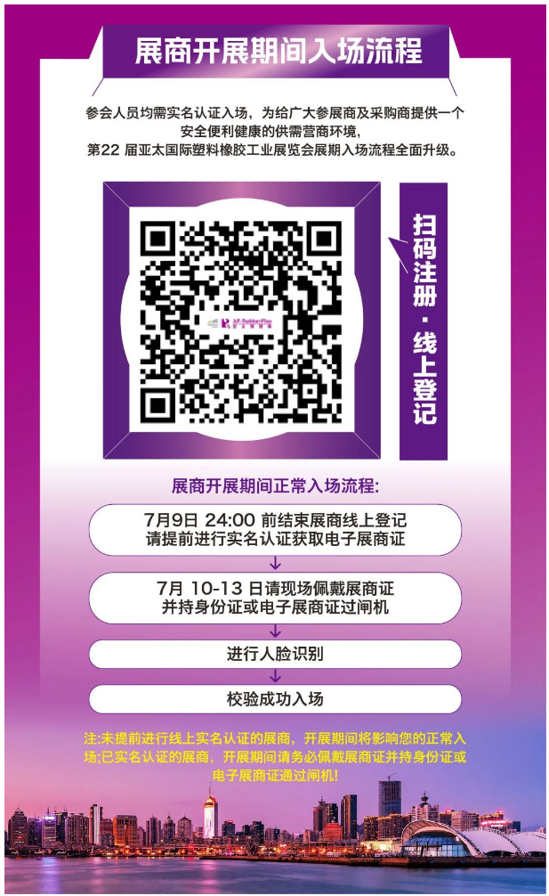 為給廣大參展商及采購(gòu)商提供一個(gè)安全便利健康的供需營(yíng)商環(huán)境,2025第22屆亞太國(guó)際塑料橡膠工業(yè)展覽會(huì)展期內(nèi)需實(shí)名認(rèn)證入場(chǎng)。