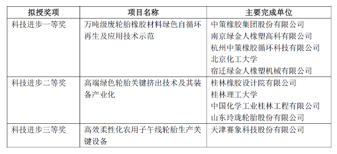 (1)入選2023年度中國石油和化學(xué)工業(yè)聯(lián)合會科學(xué)技術(shù)進步獎2023年共有3個輪胎相關(guān)項目入選2023年度中國石油和化學(xué)工業(yè)聯(lián)合會科學(xué)技術(shù)進步獎一等獎、二等獎和三等獎。分別是:“萬噸級廢輪胎橡膠材料綠色自循環(huán)再生及應(yīng)用技術(shù)示范”“高端綠色輪胎關(guān)鍵擠出技術(shù)及其裝備產(chǎn)業(yè)化”和“高效柔性化農(nóng)用子午線輪胎生產(chǎn)關(guān)鍵設(shè)備”。