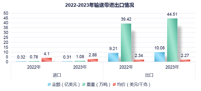 1.輸送帶根據(jù)中國海關(guān)總署的統(tǒng)計(jì)數(shù)據(jù),2023年我國輸送帶進(jìn)口總額下降(同比,下同)2.4%至0.31億美元,進(jìn)口總量增長39.1%達(dá)1.08萬噸,進(jìn)口均價下降29.8%至2.88美元/千克。輸送帶出口總額增長9.9%達(dá)10.08億美元,出口總量增長13.1%達(dá)44.51萬噸,再創(chuàng)歷史新高,出口均價下降2.8%至2.27美元/千克。