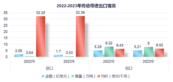 2023年我國傳動帶進(jìn)口總額下降17%至1.70億美元,進(jìn)口總量下降17.3%至0.53萬噸,均價微增0.4%達(dá)32.38美元/千克。