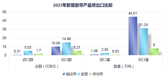 縱觀2023年整個膠管膠帶產(chǎn)品的進(jìn)出口情況,輸送帶、膠管、傳動帶三類產(chǎn)品進(jìn)口總額約7.04億美元,出口總額約30.28億美元,出口總額是進(jìn)口總額的4.3倍;進(jìn)口總量約4.43萬噸,出口總量約83.75萬噸,出口總量是進(jìn)口總量的近19倍。由此可見,我國出口規(guī)模遠(yuǎn)大于進(jìn)口規(guī)模,同時從近幾年進(jìn)出口變化來看,我國膠管膠帶產(chǎn)品出口總體呈現(xiàn)穩(wěn)步增長的態(tài)勢,而進(jìn)口仍是總體減少的趨勢,說明我國膠管膠帶產(chǎn)品在積極向海外拓展市場的同時,國產(chǎn)替代方面也做得越來越出色。