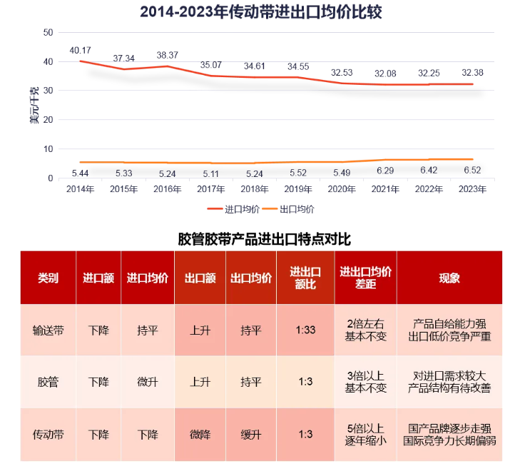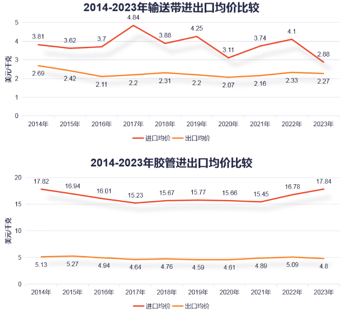以下數(shù)據(jù)為自2014年以來膠管膠帶產(chǎn)品的進(jìn)出口均價變化情況。從近十年膠管膠帶產(chǎn)品進(jìn)出口均價來看,膠管膠帶產(chǎn)品的出口均價明顯低于進(jìn)口均價。其中,輸送帶近幾年出口價格一直在2.3美元/千克以下,而進(jìn)口均價多數(shù)年份在3-4美元/千克之間;膠管出口均價長期在5美元/千克左右的低位徘徊,而進(jìn)口均價則長期在15美元/千克以上,2023年更是達(dá)到近18美元/千克;傳動帶產(chǎn)品出口均價雖然在緩慢提升,但與進(jìn)口均價存在巨大差距,進(jìn)口均價長期是出口均價的5倍以上。