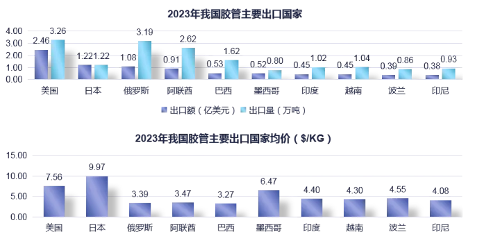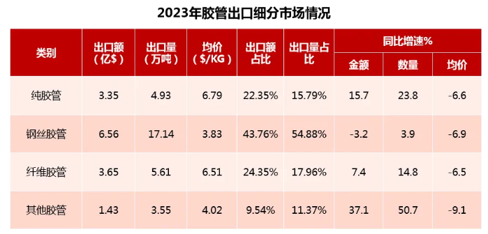 2023年我國膠管產(chǎn)品中第一大出口類型是鋼絲膠管,出口額占膠管出口總額約44%,出口量占膠管出口總量約55%,同時鋼絲膠管也是所有出口膠管類型中均價最低的類型;純膠管與纖維膠管出口額各占出口總額的兩成以上,出口量各占出口總量的不足兩成,出口均價在膠管產(chǎn)品細(xì)分領(lǐng)域較高,兩類產(chǎn)品出口份額較2022年有所上升。