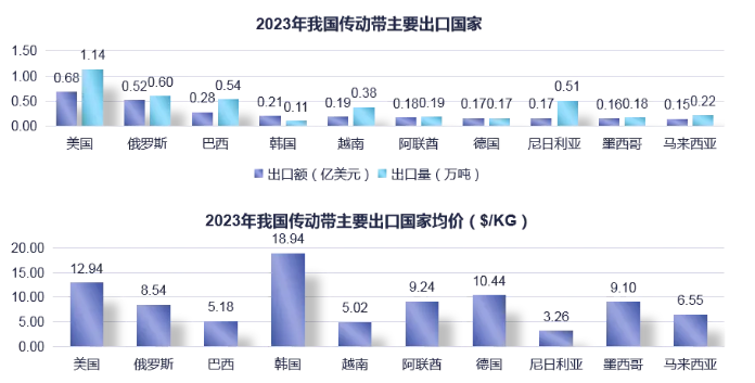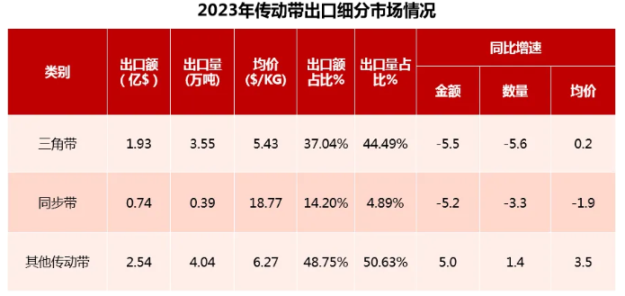 2023年我國傳動帶出口市場中均價最高的是同步帶產(chǎn)品,均價達(dá)18美元/千克以上,但其出口額只占傳動帶出口總額的不足15%,出口量只占傳動帶出口總量的不足5%,而出口均價在6美元/千克左右的三角帶及其他傳動帶出口額占了出口總額的85%以上,出口量幾乎占了出口總量的95%以上。