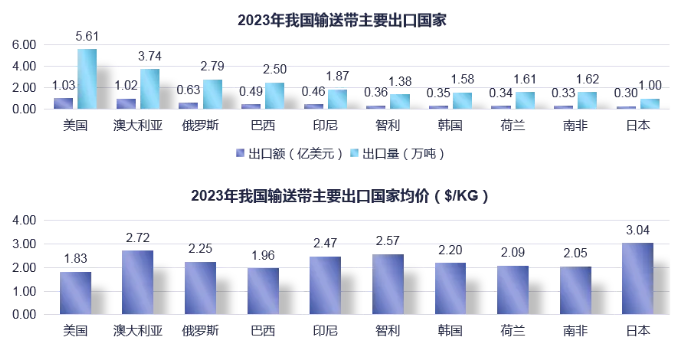 從圖表數(shù)據(jù)可知,我國輸送帶出口目的地前十位的國家分別是美國、澳大利亞、俄羅斯、巴西、印度尼西亞、智利、韓國、荷蘭、南非和日本,2023年向前十國家的輸送帶出口額增長10.5%至5.3億美元,占我國輸送帶出口總額的52.34%。在出口前十國家中,除智利、荷蘭和日本外,對其他國家的出口額均為正增長,其中,對俄羅斯出口額增幅最大,為63.8%。均價方面,對日本的出口均價最高,為3.04美元/千克;對美國出口均價最低,為1.83美元/千克,低于我國整個輸送帶行業(yè)的出口均價。
