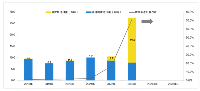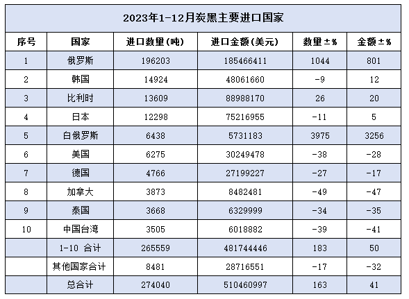 海關(guān)數(shù)據(jù)顯示,2023年我國(guó)炭黑進(jìn)口量為27.4萬噸,同比增長(zhǎng)163.23%。其中,俄羅斯成為最大的進(jìn)口來源國(guó),進(jìn)口數(shù)量為19.6萬噸,占總進(jìn)口量的71.53%。