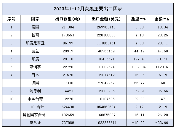 數(shù)據(jù)顯示,2023年我國(guó)炭黑出口量為72.7萬噸,同比下降10.22%,主要出口國(guó)家為泰國(guó)、越南和印度尼西亞,其出口量均較去年同期有所降低,只有出口到柬埔寨和印度的炭黑數(shù)量實(shí)現(xiàn)增長(zhǎng),埔寨同比增長(zhǎng)1389.84%,印度同比增長(zhǎng)127.4%,其它出口國(guó)家出口數(shù)量均比去年同期有所下降。