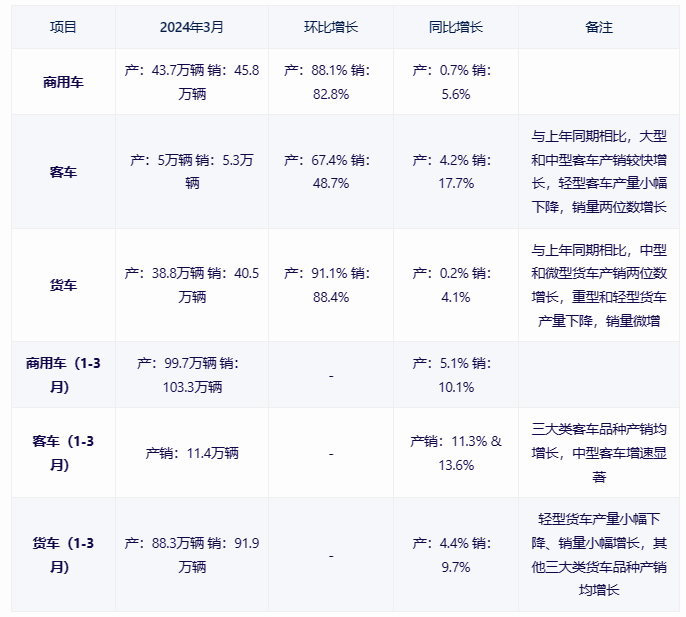 報(bào)告顯示,在商用車(chē)的主要細(xì)分市場(chǎng)中,客車(chē)與貨車(chē)的生產(chǎn)和銷(xiāo)售都取得了顯著增長(zhǎng)。具體來(lái)看,商用車(chē)在3月份的產(chǎn)量和銷(xiāo)量數(shù)據(jù)均呈現(xiàn)出積極的增長(zhǎng)態(tài)勢(shì)。據(jù)統(tǒng)計(jì),該月商用車(chē)產(chǎn)量為43.7萬(wàn)輛,銷(xiāo)量更是達(dá)到了45.8萬(wàn)輛,環(huán)比增長(zhǎng)率分別為88.1%和82.8%,而同比也實(shí)現(xiàn)了0.7%和5.6%的增長(zhǎng)。這種產(chǎn)銷(xiāo)兩旺的局面,無(wú)疑為商用車(chē)市場(chǎng)注入了強(qiáng)勁的動(dòng)力。