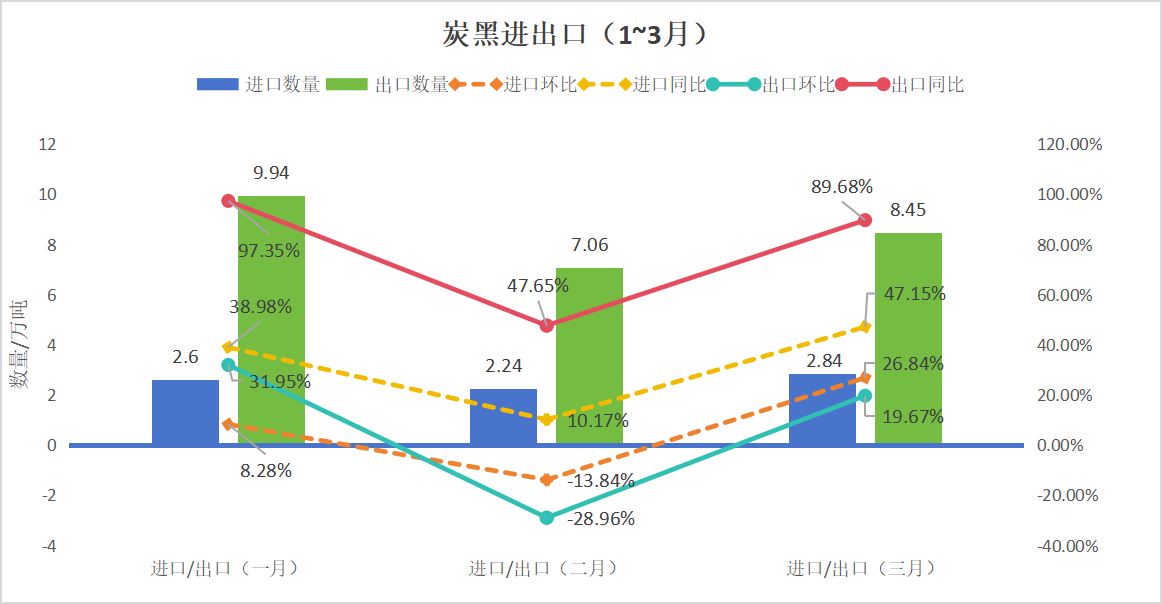 另一方面,隨著中國(guó)輪胎與汽車行業(yè)的顯著增長(zhǎng),炭黑的需求也呈現(xiàn)出強(qiáng)勁的增長(zhǎng)態(tài)勢(shì)。據(jù)統(tǒng)計(jì),2024年1月至3月,中國(guó)汽車產(chǎn)量和銷售量分別達(dá)到660.6萬輛和672萬輛,同比攀升6.4%和10.6%。這一成績(jī)不僅創(chuàng)下了自2019年以來一季度的新紀(jì)錄,而且顯示出汽車行業(yè)的穩(wěn)健發(fā)展態(tài)勢(shì)。尤其是新能源汽車領(lǐng)域,產(chǎn)銷量分別達(dá)到86.3萬輛和88.3萬輛,同比激增28.1%和35.3%,市場(chǎng)占有率穩(wěn)定在30%,彰顯了新能源汽車市場(chǎng)的巨大潛力和快速增長(zhǎng)趨勢(shì)。中國(guó)汽車工業(yè)協(xié)會(huì)的專家分析,一季度汽車行業(yè)的平穩(wěn)開局,得益于乘用車和商用車的良好銷售業(yè)績(jī),以及新能源汽車市場(chǎng)的持續(xù)擴(kuò)大。此外,整車出口的高位運(yùn)行也為行業(yè)增長(zhǎng)注入了新的活力。