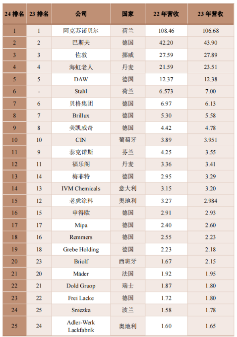 據(jù)炭黑產(chǎn)業(yè)網(wǎng)了解,盡管Grebe Holding旗下的Weilburger涂料公司在2023年的營業(yè)額仍然使其位列前25名,但由于該公司近期被關(guān)西集團(tuán)收購,因此在未來的排名中可能將不再出現(xiàn)。