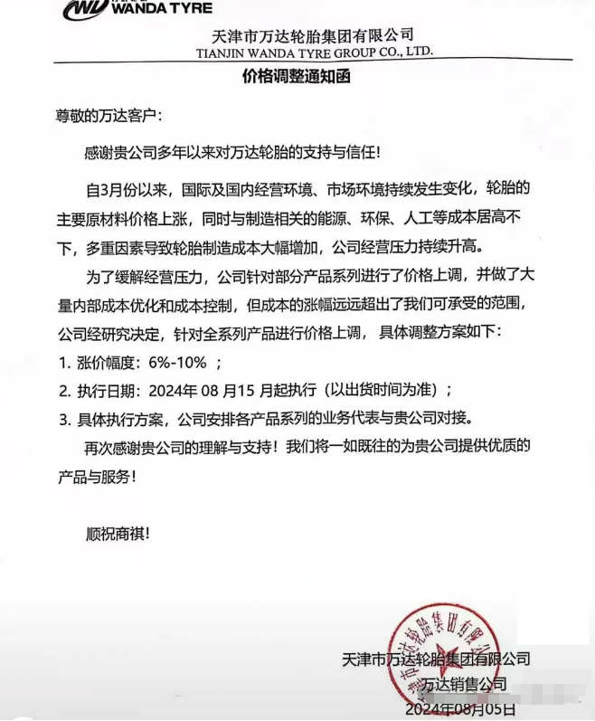 天津市萬達(dá)輪胎集團(tuán)有限公司于本月5日正式發(fā)布價(jià)格調(diào)整通知,宣布由于制造成本的顯著增加,公司計(jì)劃自8月15日起對旗下輪胎產(chǎn)品實(shí)施6%至10%的價(jià)格上調(diào)措施。