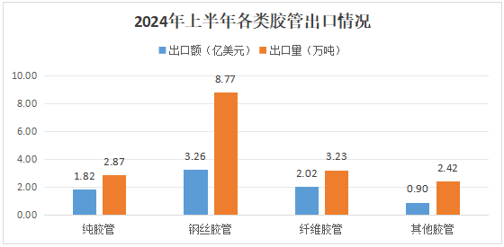 在出口細(xì)分領(lǐng)域中,純膠管的出口量增長(zhǎng)15.57%達(dá)2.87萬(wàn)噸,出口額增長(zhǎng)3.72%達(dá)1.82億美元,出口均價(jià)下降10.26%至6363美元/噸;鋼絲膠管的出口量增長(zhǎng)10.09%達(dá)8.77萬(wàn)噸,出口額微增1.05%達(dá)3.26億美元,出口均價(jià)下降8.21%至3711美元/噸;纖維膠管的出口量增長(zhǎng)16.38%達(dá)3.23萬(wàn)噸,出口額增長(zhǎng)12.02%達(dá)2.02億美元,出口均價(jià)下降3.75%至6243美元/噸。