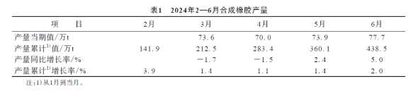 6月份,我國合成橡膠產(chǎn)量為77.7萬t,同比增長率為5.0%;1—6月累計(jì)產(chǎn)量為438.5萬t,累計(jì)增長率為2.0%。