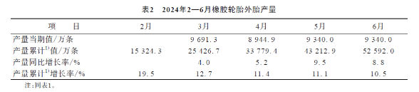 6月份,我國橡膠輪胎外胎產(chǎn)量為9340.0萬條,同比增長率為8.8%;1—6月累計(jì)產(chǎn)量為5.26億條,累計(jì)增長率為10.5%。