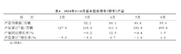 6月份,我國轎車產(chǎn)量為95.4萬輛,同比增長率為1.5%;1—6月累計(jì)產(chǎn)量為495.8萬輛,累計(jì)增長率為1.0%。