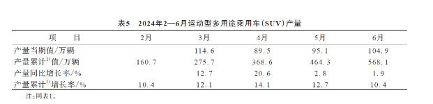6月份,我國SUV產(chǎn)量為104.9萬輛,同比增長率為1.9%;1—6月累計(jì)產(chǎn)量為568.1萬輛,累計(jì)增長率為10.4%。