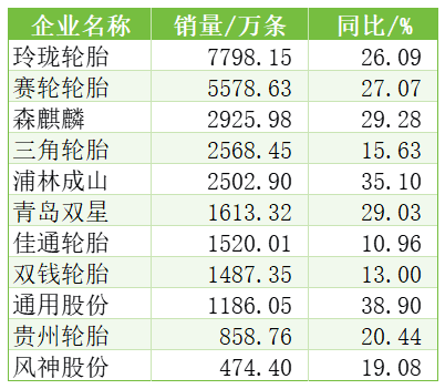 表3 11家上市輪胎企業(yè)輪胎銷量情況
